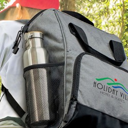 Impressive large 18L cooler bag with thick PE foam insulation encased in a water-resistant PEVA inner liner. The outer construction is 600D polyester with a large front slip pocket and two mesh side pockets. Other features include a zippered top closure, an adjustable woven shoulder strap and woven carry handles with a Velcro cuff.