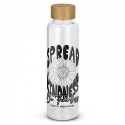 Sophisticated 600ml borosilicate glass drink bottle which has a trendy screw on bamboo lid.