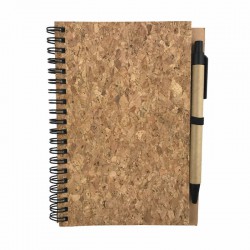 B6 soft wood cork cover notebook with side spiral bound, it has 70 leaves(140 pages) of 70gsm recycled lined paper and attached paper ball pen on the side.
