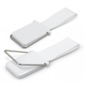 Stylish spring-loaded car phone holder which has a very prominent branding area. It has a soft rubber clip which pushes onto car air vents and securely holds a phone so it can be seen by the driver and used as a GPS.