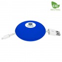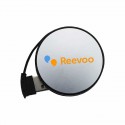 Round plastic USB hub with four ports and a USB 2.0 interface, the cable locks into the housing neatly when not in use, silver top and black back.