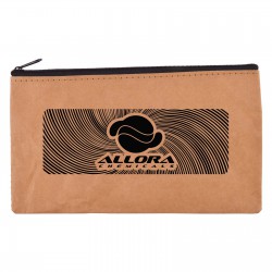 Zippered utility pouch made from kraft paper so the pouch is biodegradable. Extremely light weight and durable. Can be used to hold stationery, cosmetics, cables, first aid and travel items. Black zipper. Eco Credentials. Renewable. Recyclable. Biodegradable. Printed using reusable energy.
