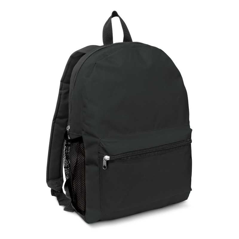 Robust backpack which is manufactured from 600D polyester. It has a main zippered compartment with an internal laptop sleeve and two zippered external pockets on the front. Other features include a padded back, adjustable woven shoulder straps, a woven carry handle, two mesh side pockets and woven zipper pulls.