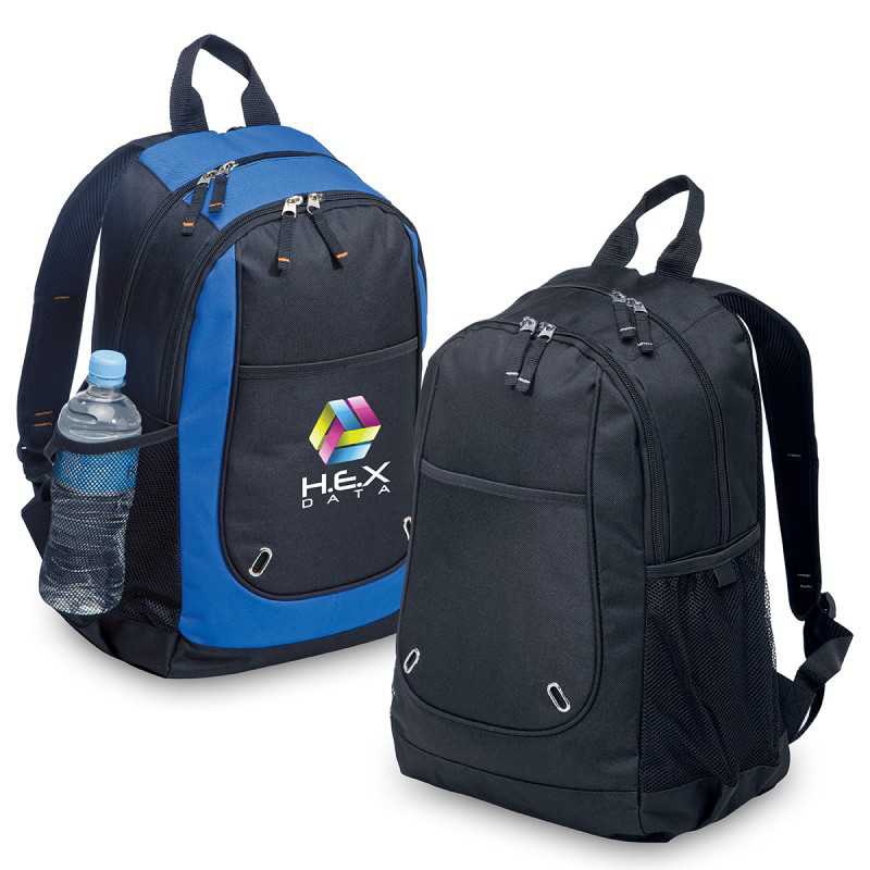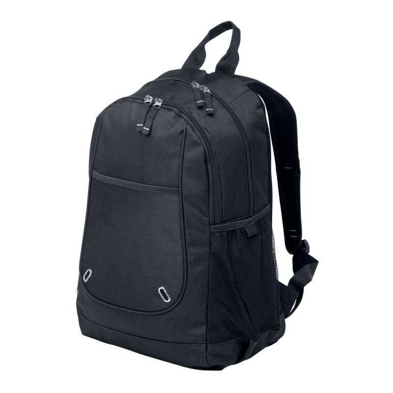 Robust backpack which is manufactured from 600D polyester. It has a main zippered compartment with an internal laptop sleeve and two zippered external pockets on the front. Other features include a padded back, adjustable woven shoulder straps, a woven carry handle, two mesh side pockets and woven zipper pulls.