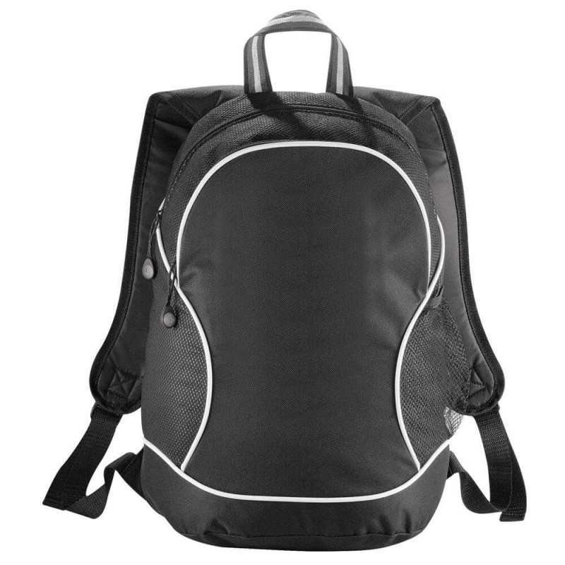 Large single compartment backpack with trendy white piping which is manufactured from 600D polyester. It has a padded back for comfortable carrying, padded woven shoulder straps which are adjustable, a zippered front pocket and two mesh side pockets.