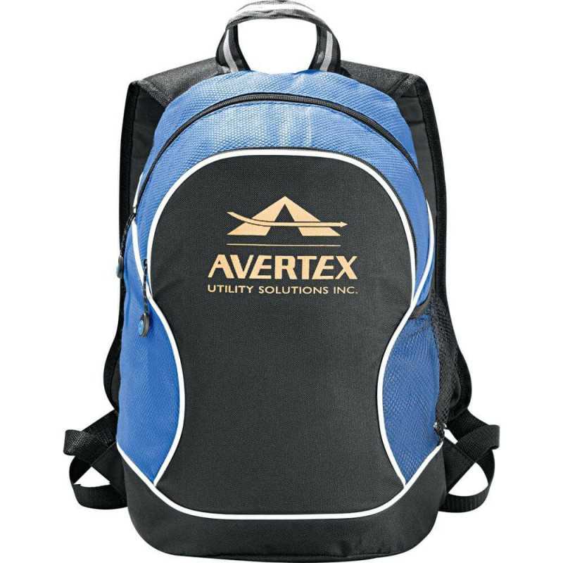 Robust backpack which is manufactured from 600D polyester. It has a main zippered compartment with an internal laptop sleeve and two zippered external pockets on the front. Other features include a padded back, adjustable woven shoulder straps, a woven carry handle, two mesh side pockets and woven zipper pulls.
