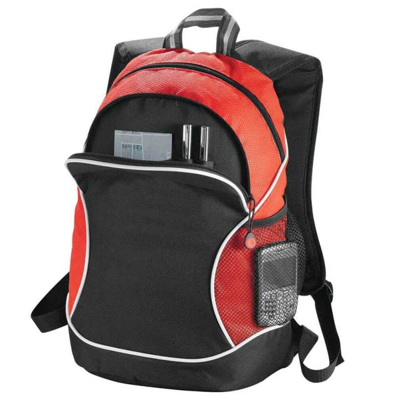 Affordable backpack which is manufactured from 600D polyester. It has a zippered main closure and adjustable woven shoulder straps with padding. Other features include a large zippered front pocket, a woven carry handle and a mesh drink bottle holder.