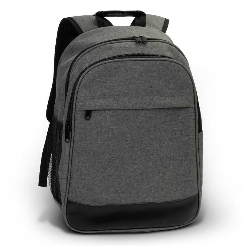 Affordable backpack which is manufactured from a combination of on-trend heather style 300D polyester and 600D polyester. It has a zippered main closure and adjustable padded shoulder straps. Other features include an internal slip pocket for a laptop, a zippered front pocket and a woven carry handle.