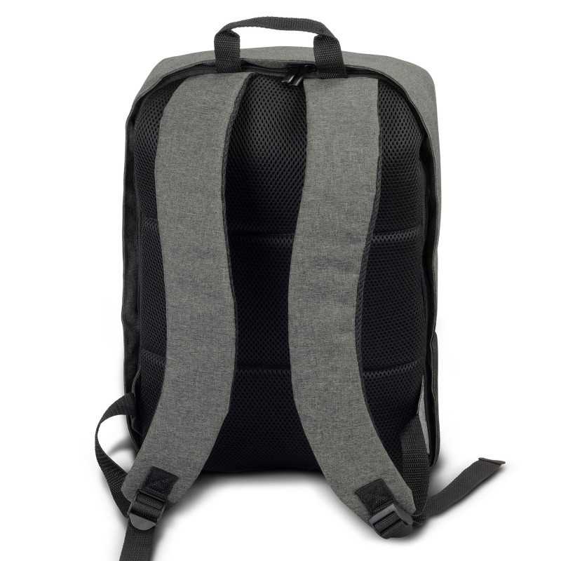 Fashion-Inspired backpack which is manufactured from poly-canvas with an on-trend heather style finish with a PU strip. It has padded woven straps that are adjustable, a padded back and a padded internal laptop compartment. Other features include a large zippered concealed pocket on the front, two mesh side pockets and a woven carry handle.