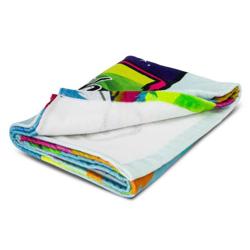 Vibrant beach towel with stunning edge-to-edge full colour sublimation print. This 1400mm x 700mm beach towel has a soft 190gsm polyester crystal fleece surface and an absorbent 230gsm cotton terry towel backing, with overlocked edges for added durability.