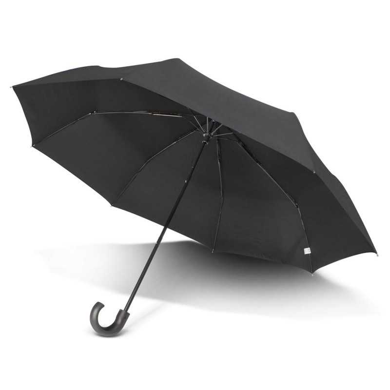 Straight-handled folding umbrella with auto open. Fits easily into a briefcase or laptop bag.
