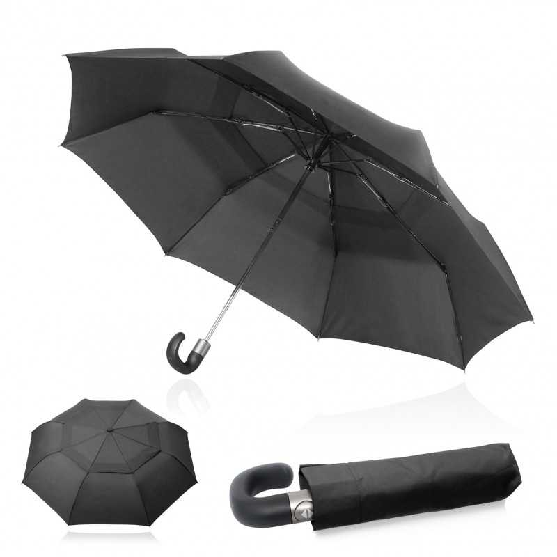 Whilst sheltering their partners from the elements, this 54cm umbrella will expose your clients promotional logo to a wide audience with style and practicality. 54cm Wind Vented, Folding Umbrella*Auto open/close*3 section nickel steel shaft*Aluminium ribs*Black rubber coated handle*190T polyester*Steel tips
