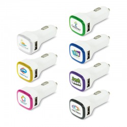Dual car charger with a 3.1 Amp output that will charge two phones at once. It has a translucent LED insert that lights up when it is in use. They can be customised with full colour branding and the choice of eight different coloured translucent inserts.