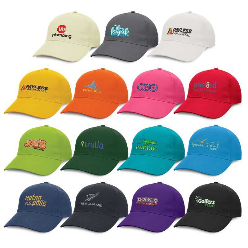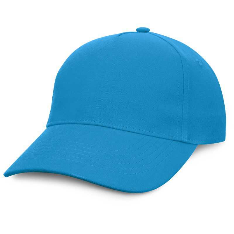 Premium quality structured five panel cap which is manufactured from 100% cotton. It features a coloured trim of your choice, embroidered eyelets, a pre-curved peak, a sweat band and an adjustable Velcro closure which allows one size to fit most people.