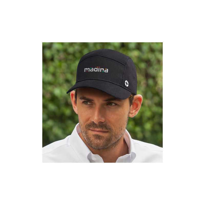 Stylish 100% Cotton 5 panel curved peaked cap with a coloured stitching that matches the logo. It features an adjustable stainless-steel buckle, ensuring a comfortable fit for most head sizes.