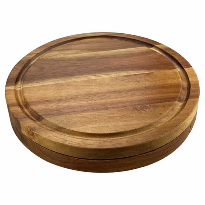 Tasteful bamboo cheese board which swivels open to reveal two cheese knives and a cheese fork neatly stored inside. Wood is a natural material which produces unavoidable variances in the grain pattern, colour and branding.