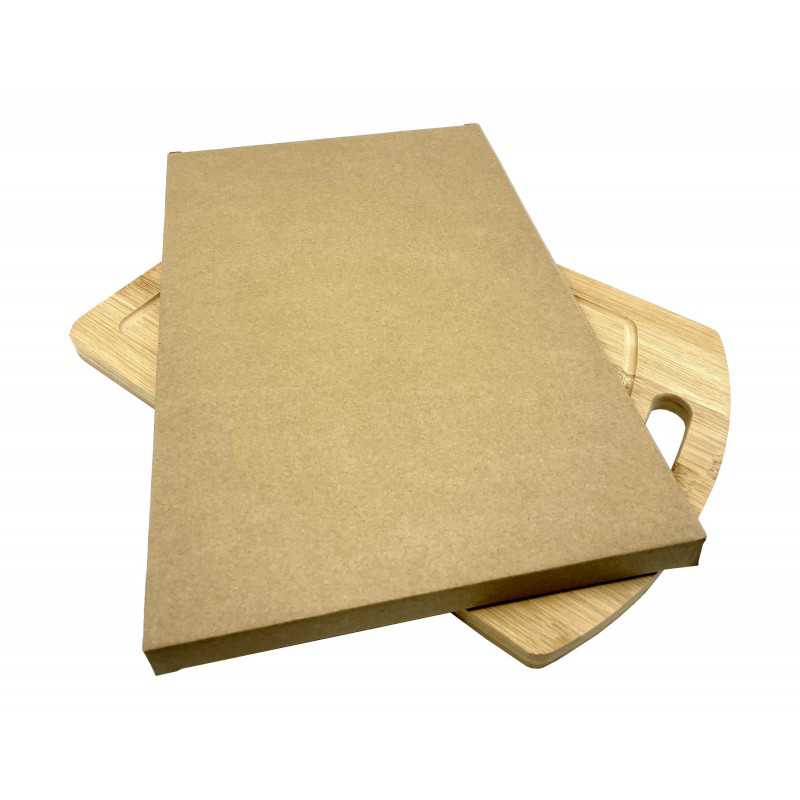 Deluxe natural slate serving board with four soft non-slip and non-marking polyurethane pads on the base. It has natural hemp rope handles and is beautifully presented in an unbleached cardboard gift box.