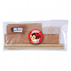 Stationery set in unbleached recyclable cardboard box. Contains 3 x natural case lead pencils, 15cm timber ruler, white eraser & natural pencil sharpener.Eco Credentials: Sustainable, recyclable, and printed using renewable energy.