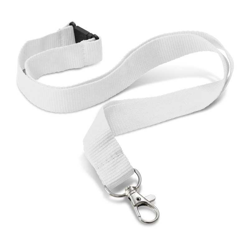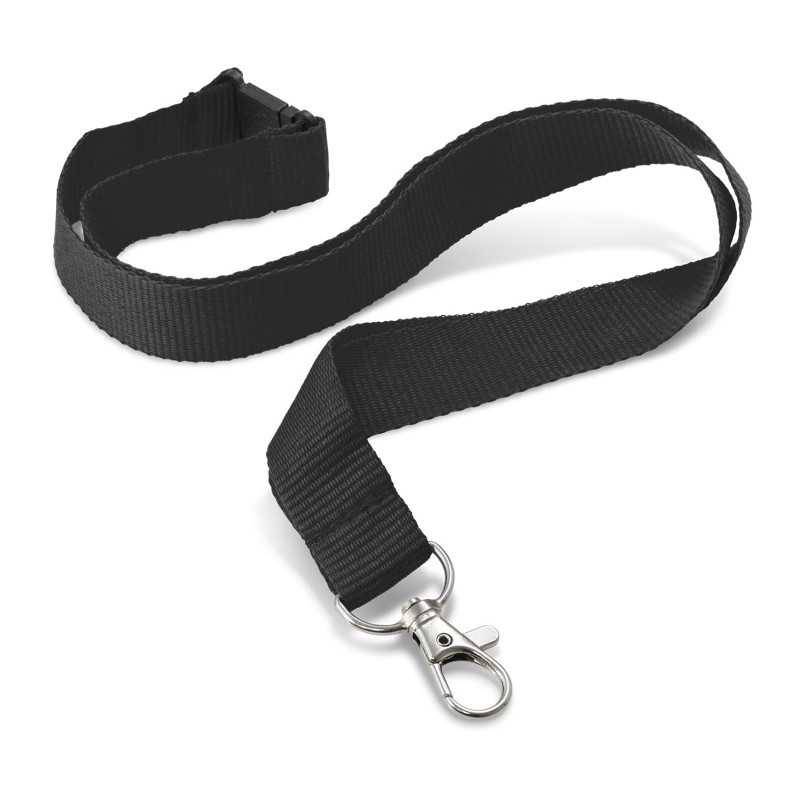 20mm wide polyester lanyard with a metal clip and a safety clip. It can be branded in one colour on one side.