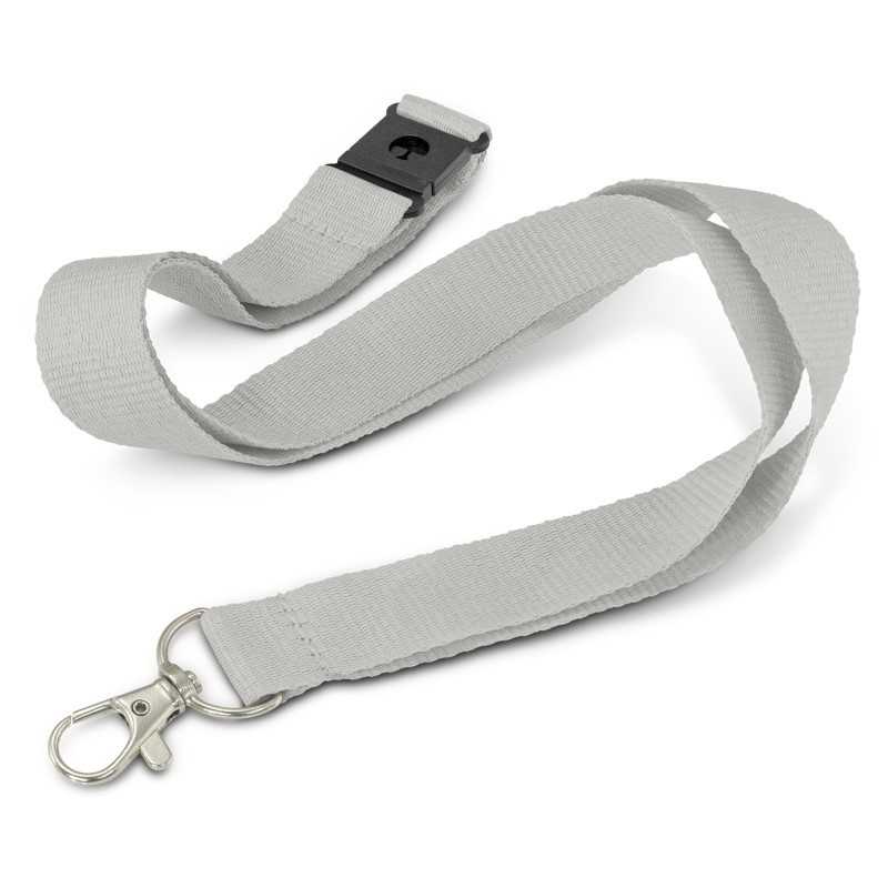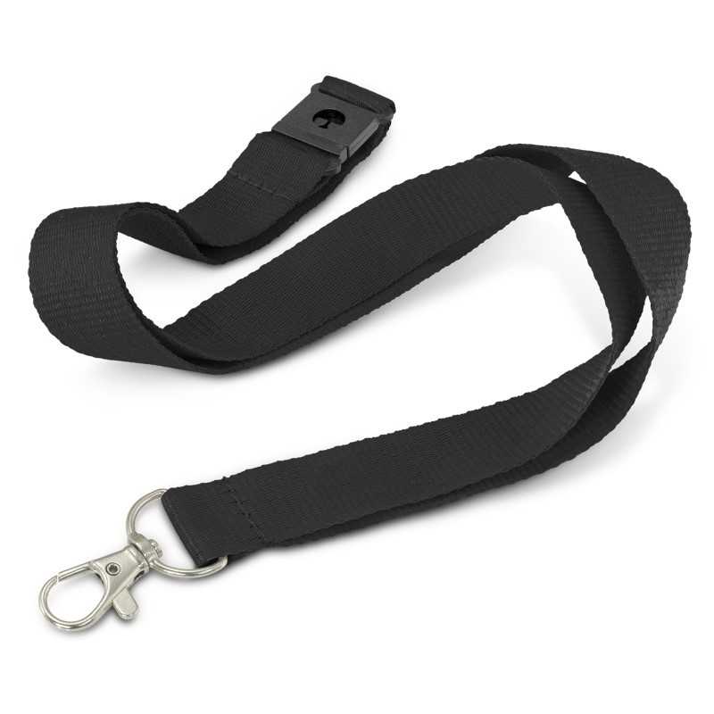 20mm wide polyester lanyard with a metal clip and a safety clip. It can be branded in one colour on one side.