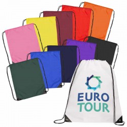 Robust medium-size drawstring backpack which is manufactured from 210D polyester and can be branded in spot colours or full colour on both sides at no extra cost. It has riveted metal eyelets at the base for added strength and black woven drawstrings. A production lead time of 20 working days applies to this product by air freight and larger orders can be...