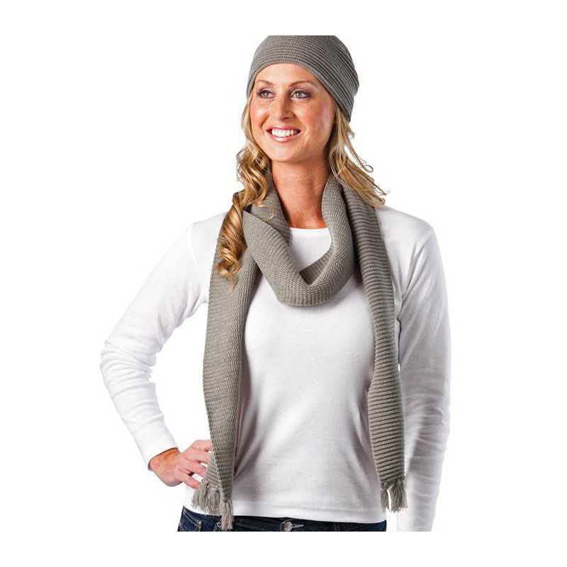 Stylish and warm the Cable Knit Scarf is smart enough for business wear or outdoor corporate functions. Acrylic knit with cable knit row|Scarf pulls through end loop to create neck wrap
