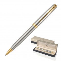 Stunning in stainless steel finish with elegant gold trim, the Parker Sonnet Ballpoint Pen offers an elegant twist action, retractable ballpoint. Parker pens can be printed or engraved (silver finish) on cap or upper barrel providing great options for your clients promotional logo. Twist action, retractable ballpoint