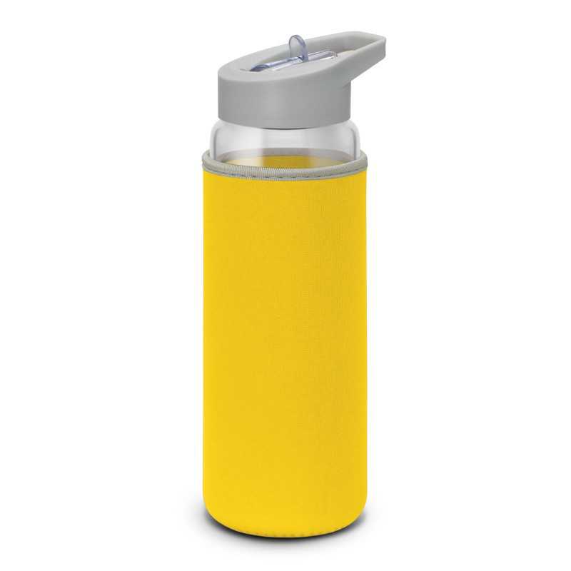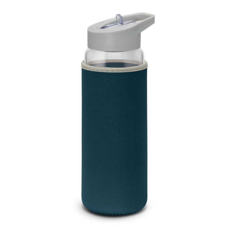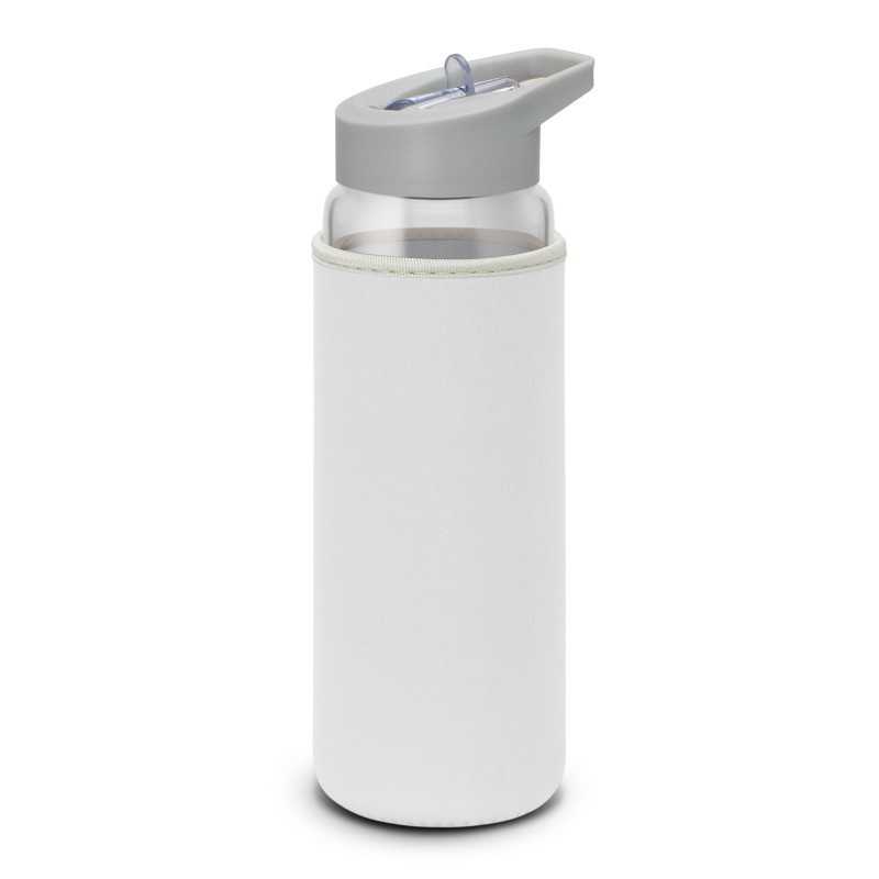 Deluxe 600ml borosilicate glass drink bottle which features an insulating soft neoprene sleeve that helps to keep drinks cool. The sleeve is nicely accented with grey neoprene trim and a grey woven polyester handle. It has a secure screw on stainless steel lid which can be laser engraved with a logo. Borosilicate is a lightweight glass that is...