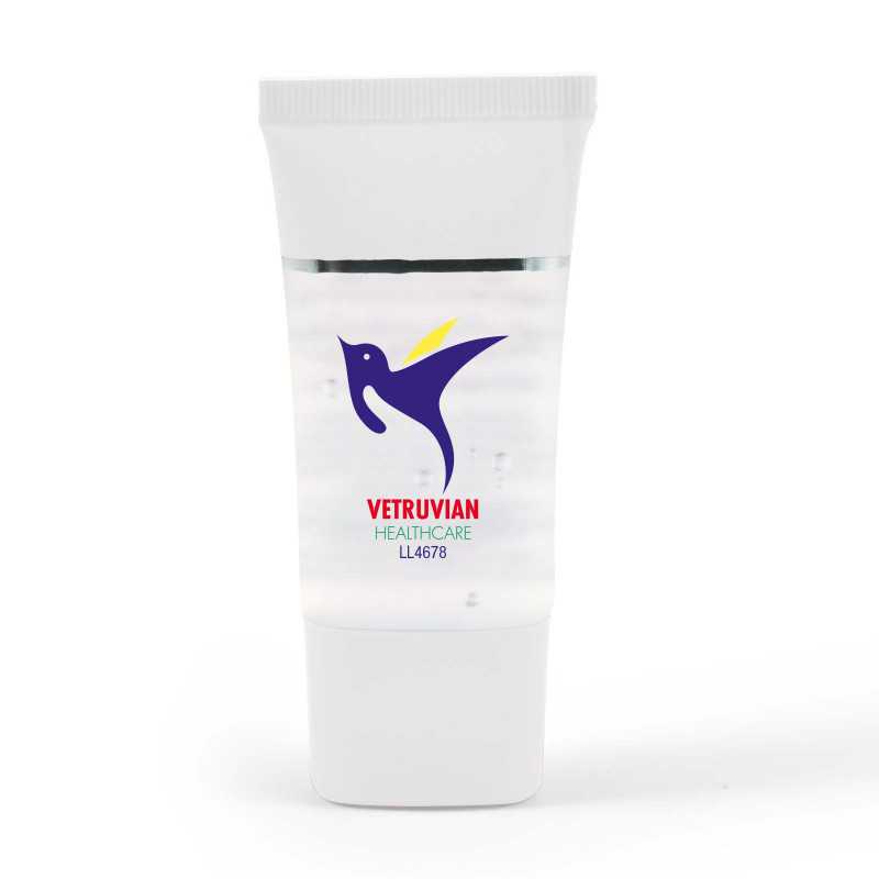 30ml alcohol based clear gel. Includes moisturiser and Vitamin E in white plastic squeeze bottle. Kills most germs. Leaves hands feeling refreshed and clean. 62% alcohol content.