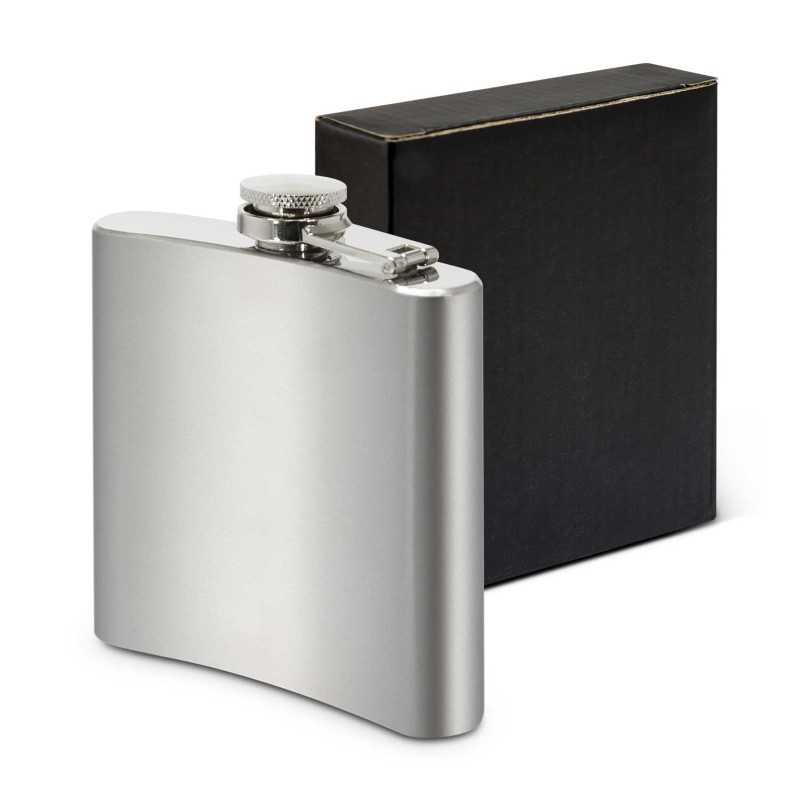 200ml stainless steel hip flask with a hinged screw top lid. It laser engraves to a natural etch and is presented in a black gift box.