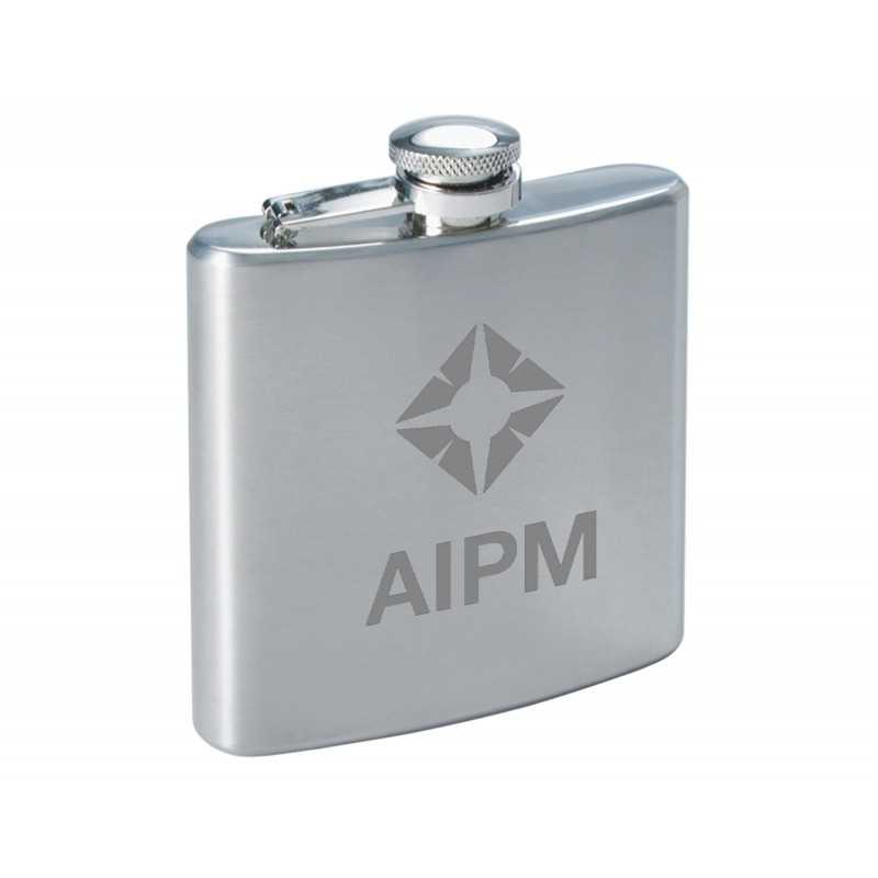 A 180ml personal stainless steel hip flask with a hinged screw on top.