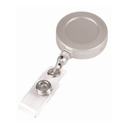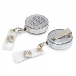 Retractable stainless steel ID holder with a reliable steel spring. It has a standard dome attachment for holding a plastic ID card holder and a pocket clip on the reverse. Clear vinyl ID holders are available on request.