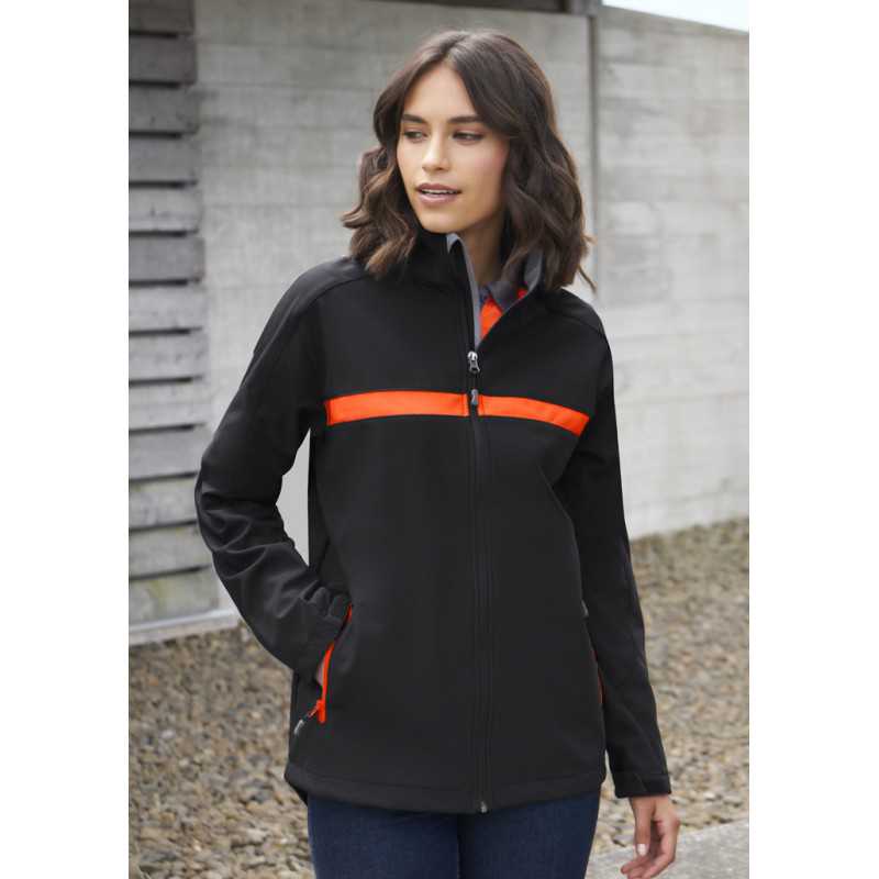 Ladies’ wind and water repellent softshell jacket. Two side pockets with zips and one inner pocket.|Patch pocket on sleeve with zipper.|Adjustable drawstring at bottom hem and Velcro|®| adjustable cuffs.|Curved back side of garment, longer than front.|Tailored fit. |3 layer bonded fabric, 100% Polyester, Microfleece and Elastic Polyester with PU...