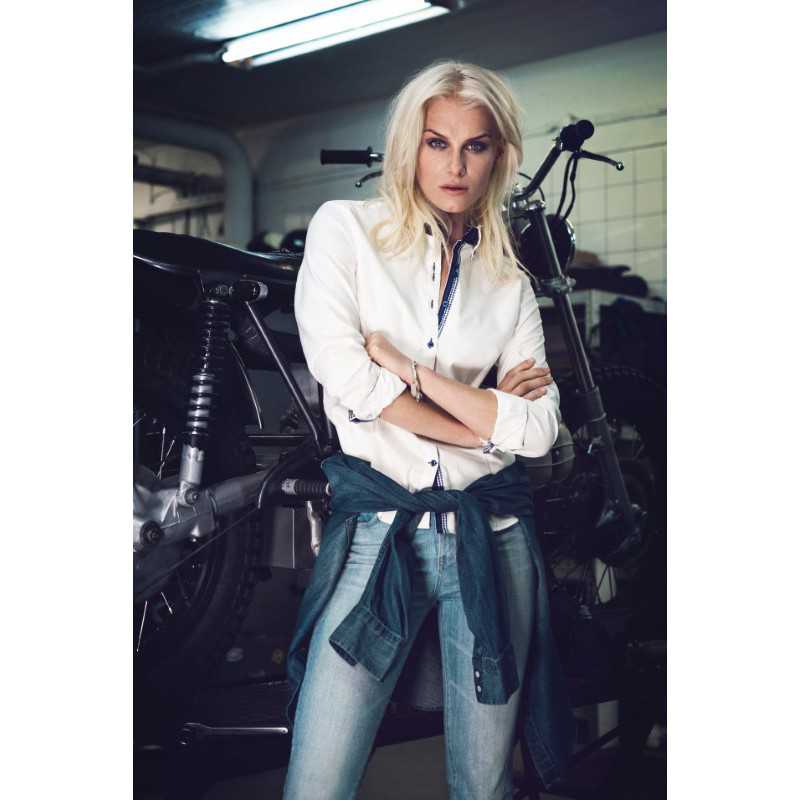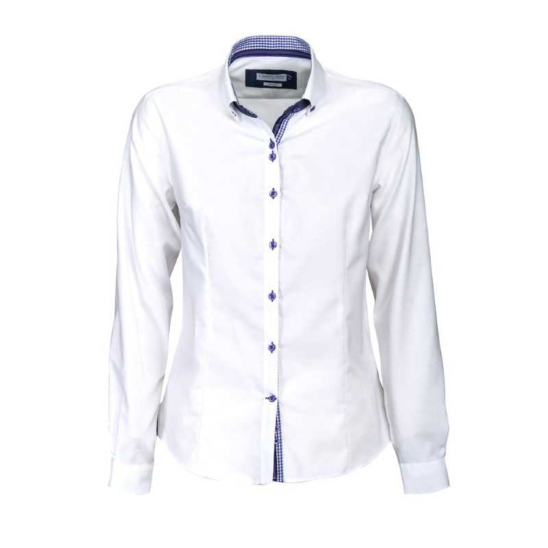 Cuff detail with buttons,Waist and bust darts for shape,Available in Blue or White. Fabric: 100% Cotton Mini Herringbone fabric,Easy iron wrinkle free liquid ammonia treated fabric.