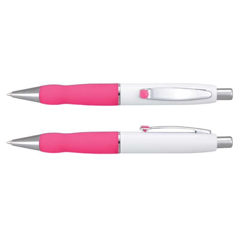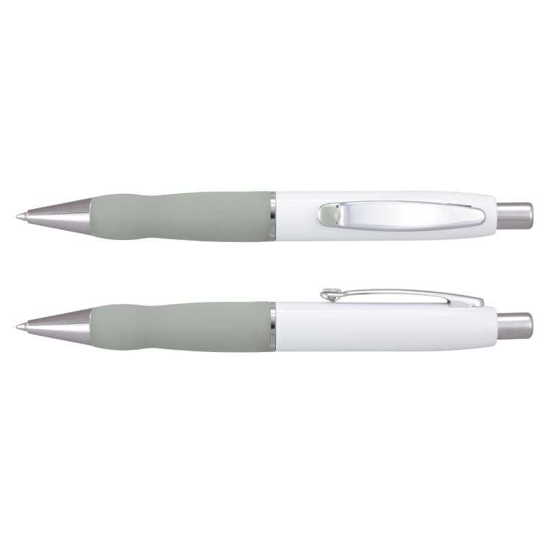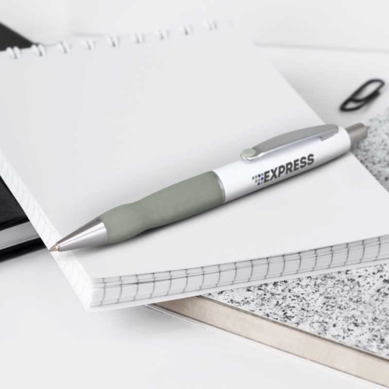 Retractable aluminium ballpoint pen with a painted gloss white barrel, shiny chrome accents and a coloured silicone grip with matching end cap. It has a large volume refill with 1200 metres of black German manufactured Dokumental ink. Panama can be presented in an optional pen sleeve or a gift box.