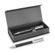 Retractable aluminium ballpoint pen with a lacquered barrel and shiny chrome accents. It has a large volume refill with 1200 metres of black German manufactured Dokumental ink. Panama can be presented in an optional pen sleeve or a gift box. The black and white pens have the option of blue ink.