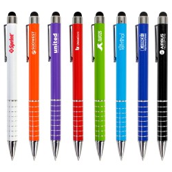 The Canterbury Stylus pen is an elegant brass twist action pen with silver accents and a stylus. Add a touch of elegance to your companys promotional event by featuring this fantastic marketing tool. The stylus works on all touch screen devices; such as smart phones, tablets and iPhones. This product includes black ink.
