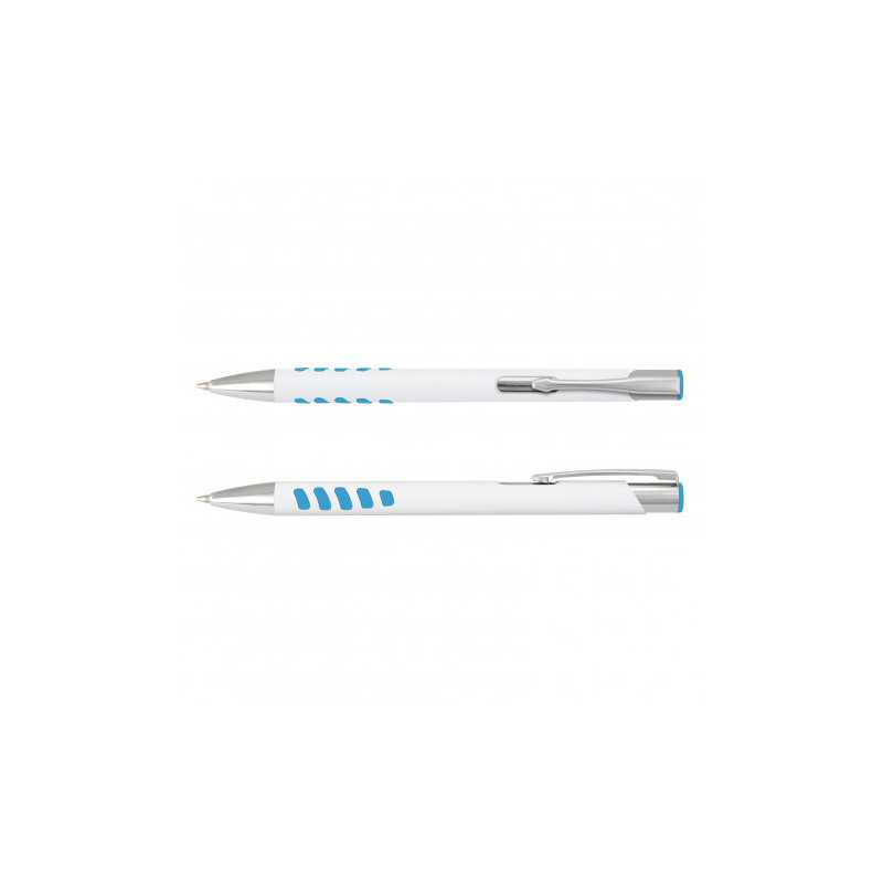 Retractable aluminium ballpoint pen with a painted gloss white barrel, shiny chrome accents and a coloured silicone grip with matching end cap. It has a large volume refill with 1200 metres of black German manufactured Dokumental ink. Panama can be presented in an optional pen sleeve or a gift box.