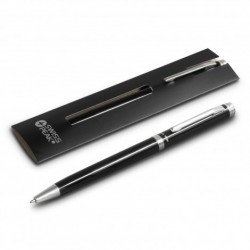 Twist action brass ballpoint pen which has a lacquered barrel and shiny chrome accents. It has a black large volume refill with 1600 metres of writing ink and can be presented in an optional pen sleeve or a gift box.