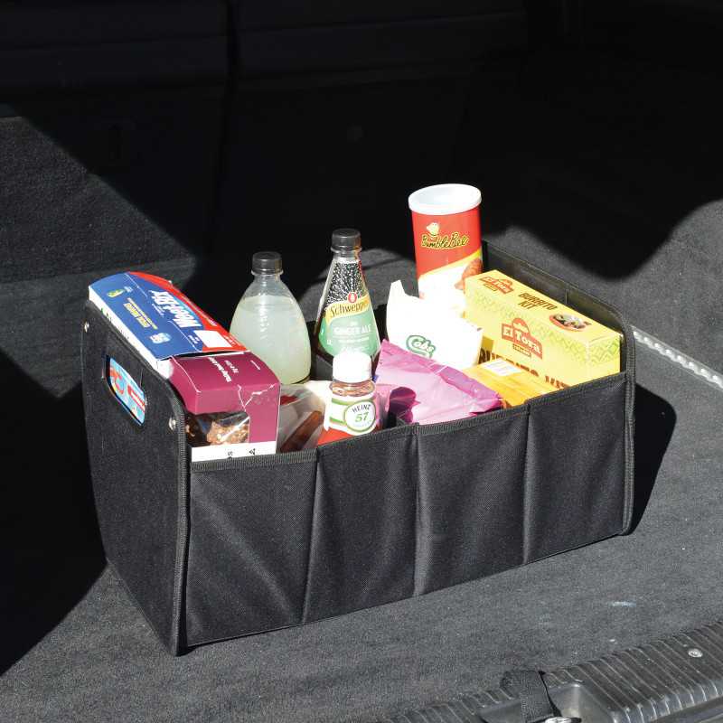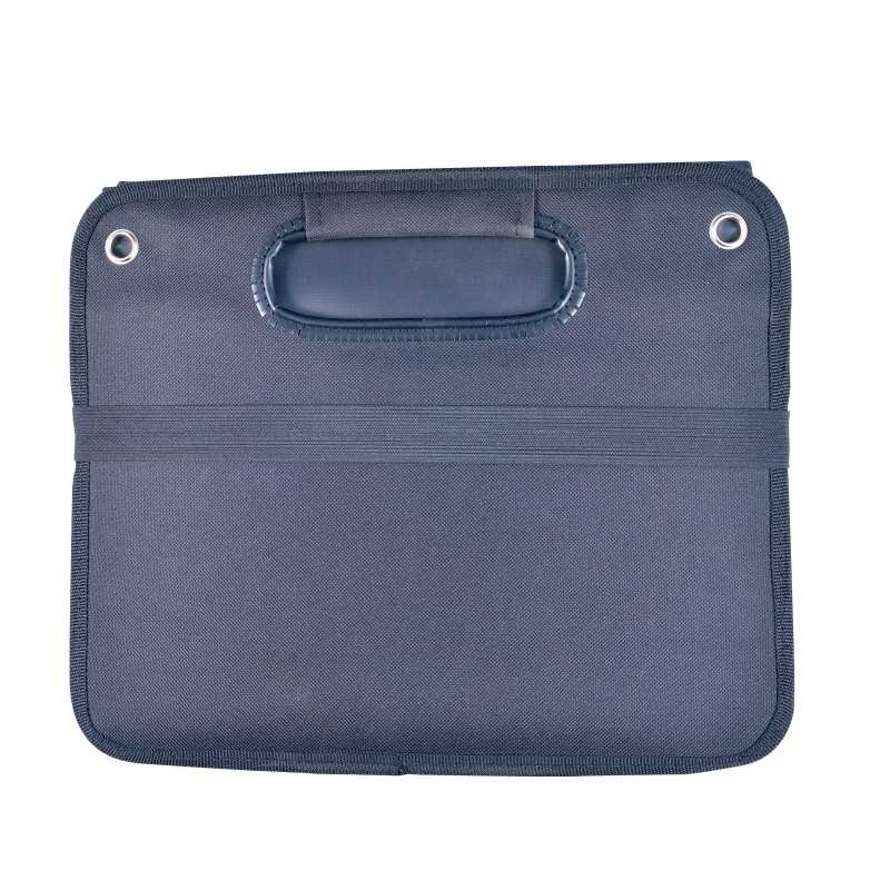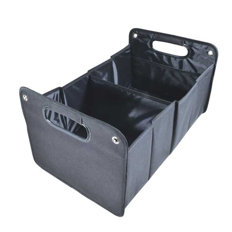 Durable 600D polyester storage / car boot organiser. With 2 carry handles. Includes two large compartments. Perfect for organising clutter in the car or for transporting groceries. Can be easily folded away with elastic retaining strap when not in use.