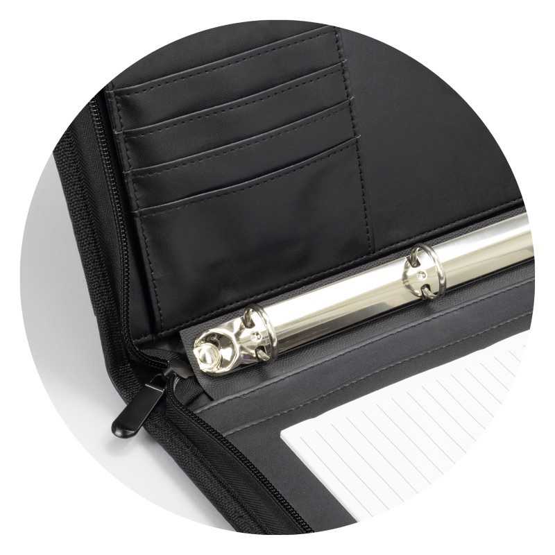 A4 zippered notepad in 600D black nylon with leather-look spine, pen loop and business card pocket. Optional black dual powered calculator D980.