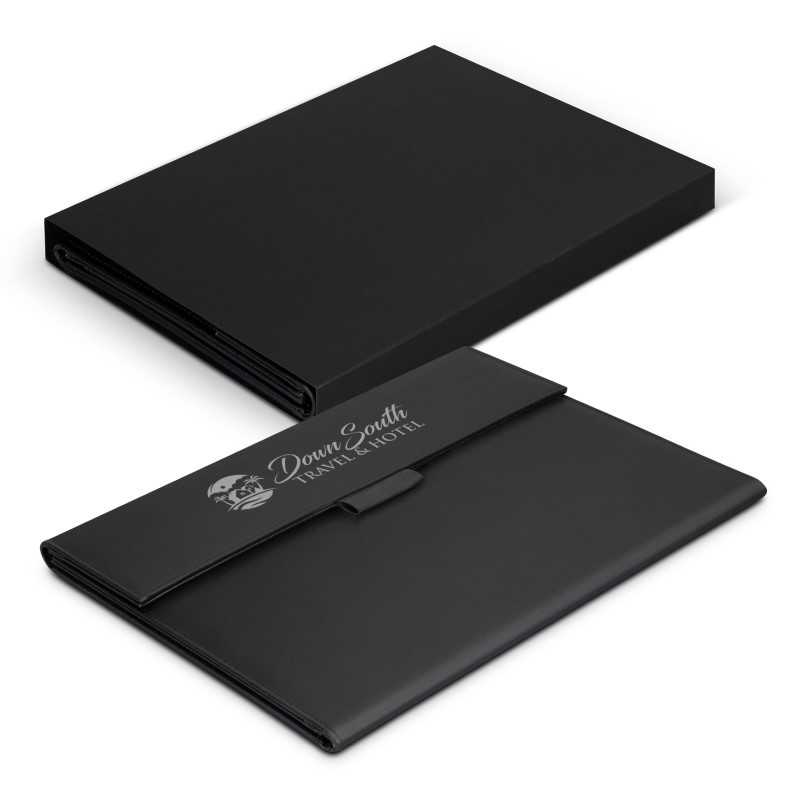 A quality A5 portfolio made with a soft grain finish. Your logo can be printed onto the portfolio or engraved on the brushed chrome accent plate (optional). Features include a soft grain finish outer, micro-fibre inner, brushed silver accent plate, note pad (30 pages), pen loop, card pocket and an internal brochure pocket. (Pen not included).
