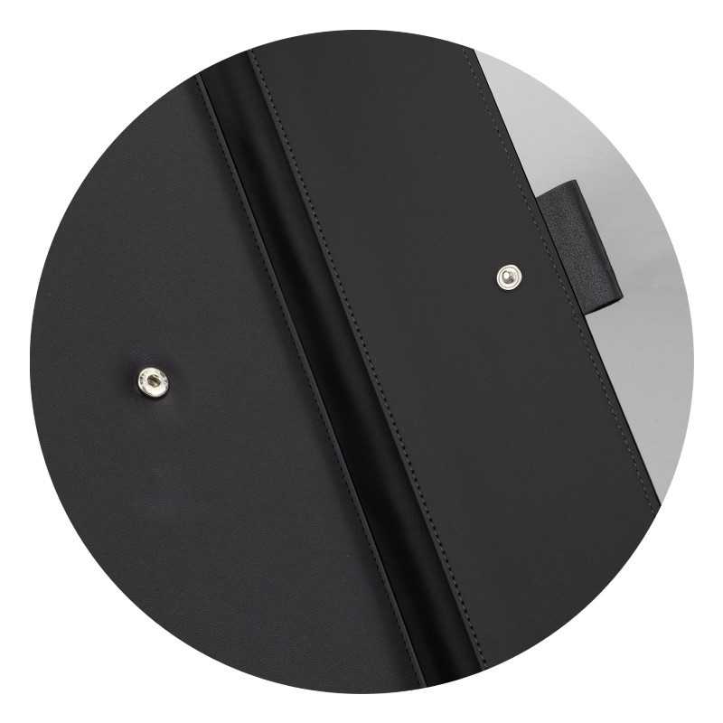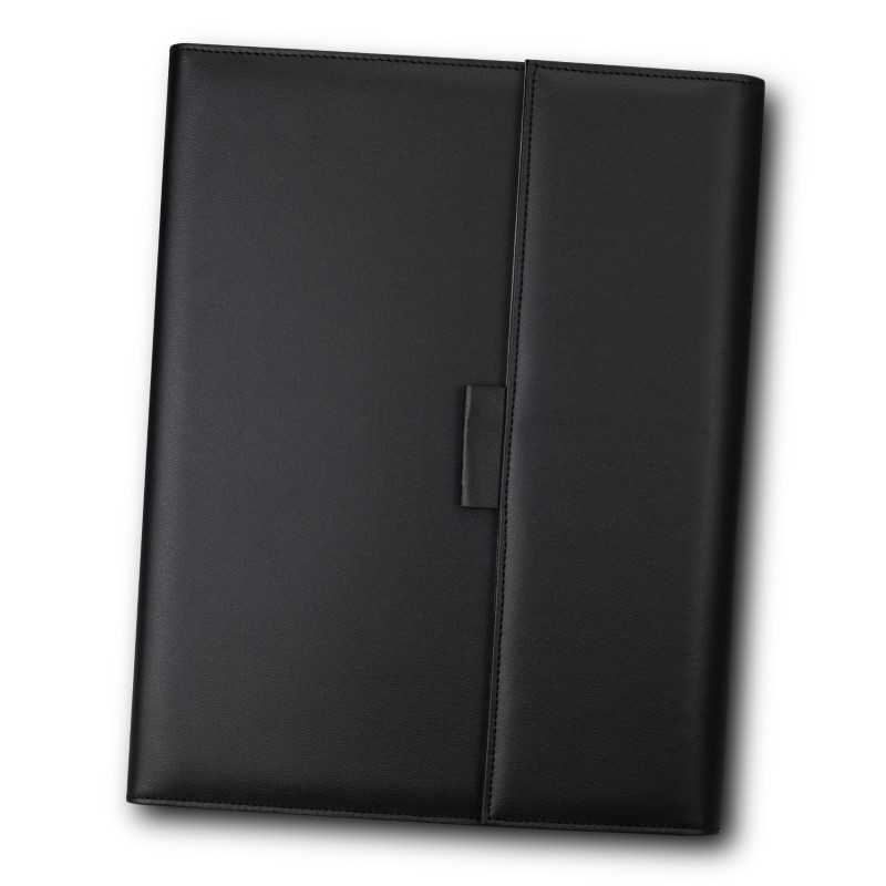Secure thermo PU leather portfolio with a unique metal and elastic loop closure. It comes with an A4 lined pad, two slip pockets, six business card holders, three large document slip pockets, a fine mesh pocket, and a single card holder.