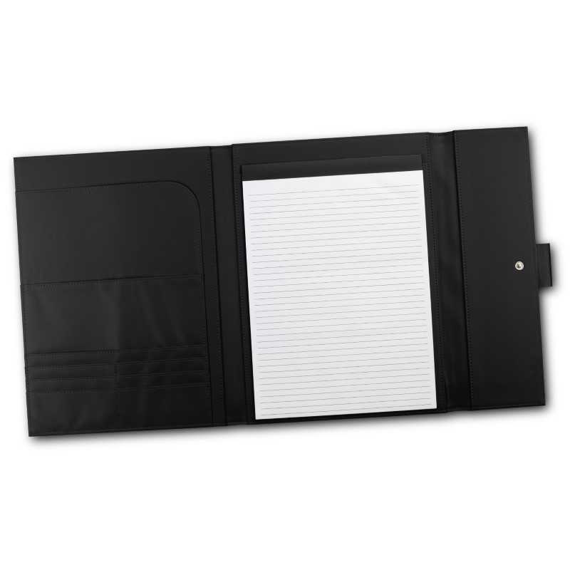 Polyester tri-folder with separate front pocket for document storage, internal business card pockets, pen loop and A4 lined notepad. Both compartments with magnetic closures.