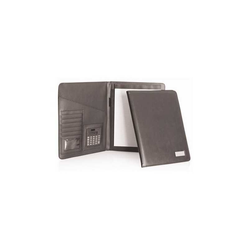 Black grained leather-look material|A4 notepad|business card pocket and pen loop. Optional dual powered D980 calculator.