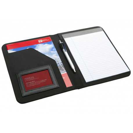 Leather look outer and inner A4 lined pad - 50 pages Dual powered calculator 6 card holder Inner storage sleeve and pen holder Metal badge Pen not included