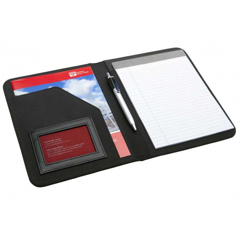Economically priced, 600D black Nylon with leather-look spine, A4 notepad, pen loop and business card pocket. Optional black dual powered calculator. Note: Pen not included, for display purposes only.