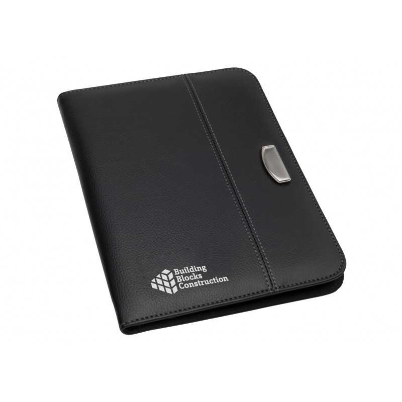 Secure thermo PU leather portfolio with a unique metal and elastic loop closure. It comes with an A4 lined pad, two slip pockets, six business card holders, three large document slip pockets, a fine mesh pocket, and a single card holder.