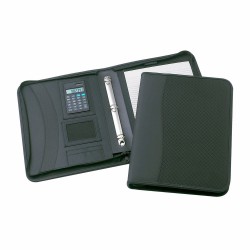 A4 zippered notepad in 600D black nylon with leather-look spine, pen loop and business card pocket. Optional black dual powered calculator D980.
