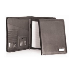 Leather look outer and inner A4 lined pad - 50 pages Dual powered calculator 6 card holder Inner storage sleeve and pen holder Full zipper Metal badge Pen not included